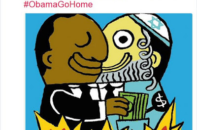 The Madrid branch of Izquerda Unida, or United Left, on Thursday tweeted the cartoon image, which depicts a thick-lipped Obama standing behind a wall amid explosions while hugging a Jew with side curls, a kippah emblazoned with the Star of David and a suit in the light-blue color on the Israeli flag. The Obama character is shown slipping a wad of cash in or out of the Jew’s pocket. It used the hashtag #ObamaGoHome.