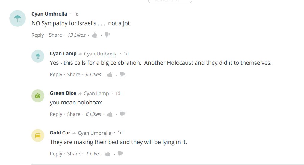 "I personally never rejoice the death of a human being, even if it is an occupation soldier or a murderer. I wouldn’t even rejoice the deaths of Nazi soldiers if I was living in the 1940’s. However if people living in the Warsaw ghetto rejoiced the death of Nazi soldiers back then, who am I to judge?"